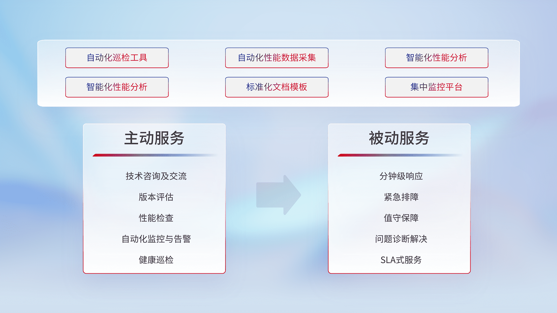 智能化工具和标准化文档,,,,保障服务质量,,,,提供主动服务(包含技术咨询、、版本评估、、、、性能检查、、、自动化监控与告警、、健康巡检)和被动服务包含(分钟级响应、、、紧急排障、、、值守保障、、问题诊断解决、、SLA服务)。。